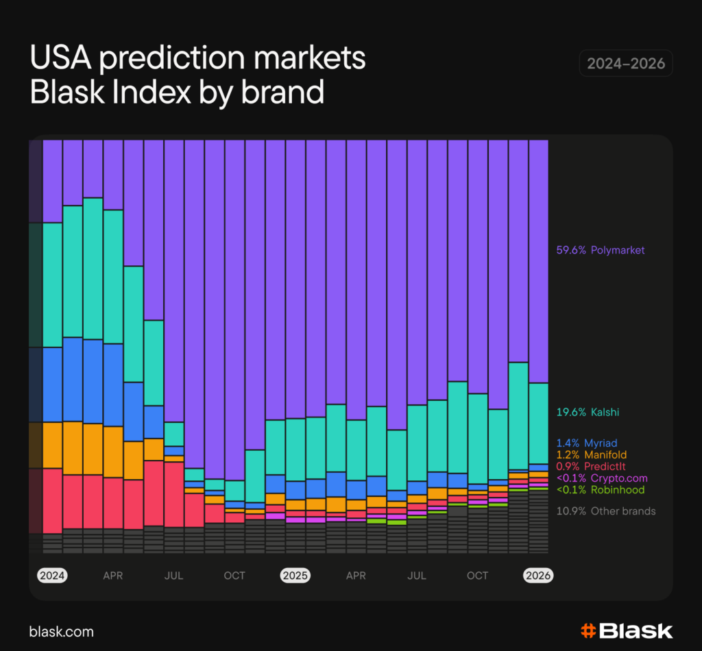 Blask data also show consolidation rather than fragmentation. Polymarket dominated through most of 2024 and 2025. Kalshi regained momentum later in 2025 as its sports markets expanded. Despite 10 new brands launching during the last year, the long tail kept shrinking. By early 2026, at least 17 platforms were active in the US, with roughly 20 more in launch or approval stages.