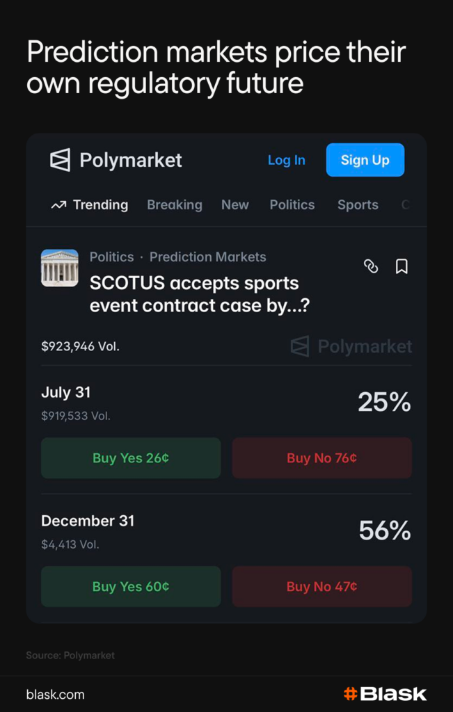 Prediction markets complicate things further, as they claim they are outside states’ jurisdiction. States disagree: more than 20 active legal and regulatory actions are pending, with courts reaching contradictory conclusions. The CFTC has formally declared it will defend its exclusive jurisdiction. The dispute is widely expected to reach the Supreme Court — Polymarket users are pricing it at 56% by the end of 2026.