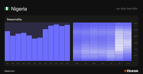 A análise da Blask sobre cinco mercados africanos, publicada em fevereiro de 2026, mostra exatamente quanto o timing varia. A Nigéria atinge o pico no sábado, com um amplo bloco de atividade durante boa parte do dia. O Quênia concentra a atividade no horário nobre, com uma cauda antes do amanhecer. O Egito atinge o pico depois da meia-noite, refletindo seu fim de semana de sexta a sábado. Uma única programação de comunicação para vários mercados perderia a maior parte da demanda em pelo menos dois desses cinco países.