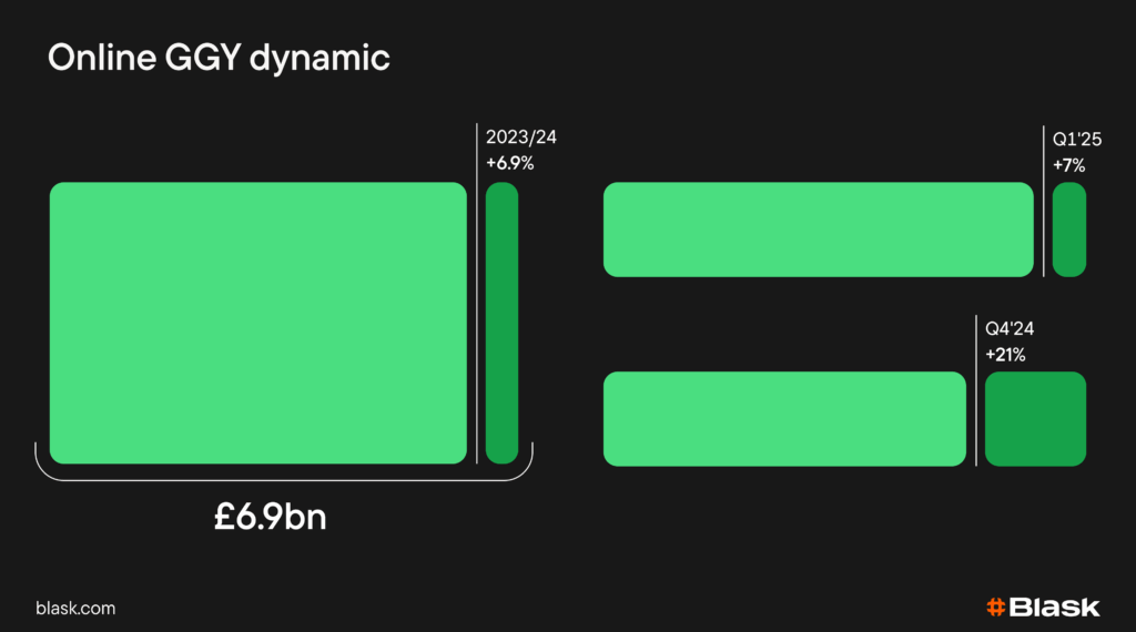 But the business headline is different: online GGY grew 6.9% to £6.9bn in 2023/24, with Q4’24 +21% and Q1’25 +7%; slots +11–15%. Mature market, loyal cohorts, omnichannel apps — less search, more direct. Quiet table, growing chip stack.