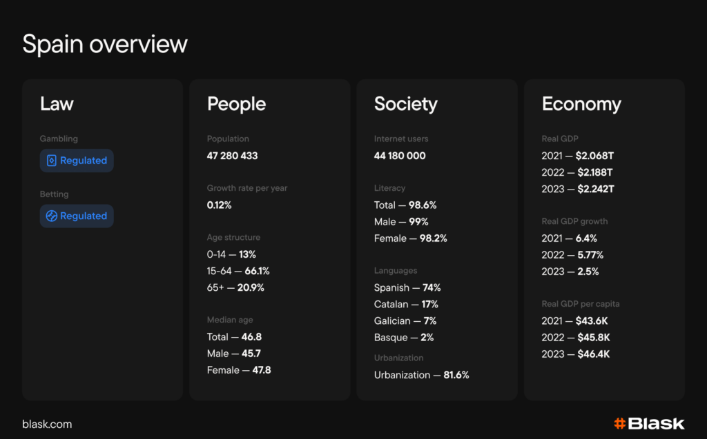 Spain is Western Europe’s fourth-largest economy, with 47.3 million people and 96% internet penetration. Social media reaches 89% of adults, and the country’s football obsession translates directly into betting behavior. 55% of players engage with traditional sports, with La Liga fixtures driving predictable weekly spikes.
