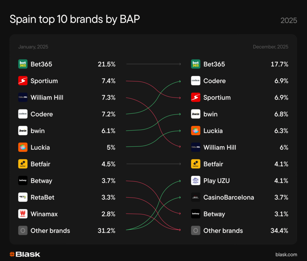 - Bet365 remains dominant but lost ground. The leader’s erosion benefited second-tier challengers.