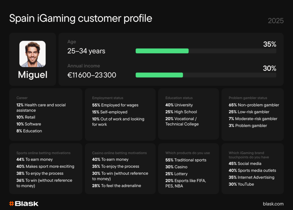 The typical Spanish iGaming customer is a university-educated male under 35, earning a modest €10,000–€30,000 annually — reflecting the broader Spanish economic context. The motivation split is telling: sports bettors play primarily to enhance the viewing experience and support their team, with money a secondary driver; casino players lean more toward adrenaline and process enjoyment.