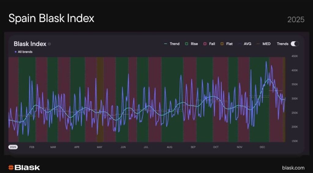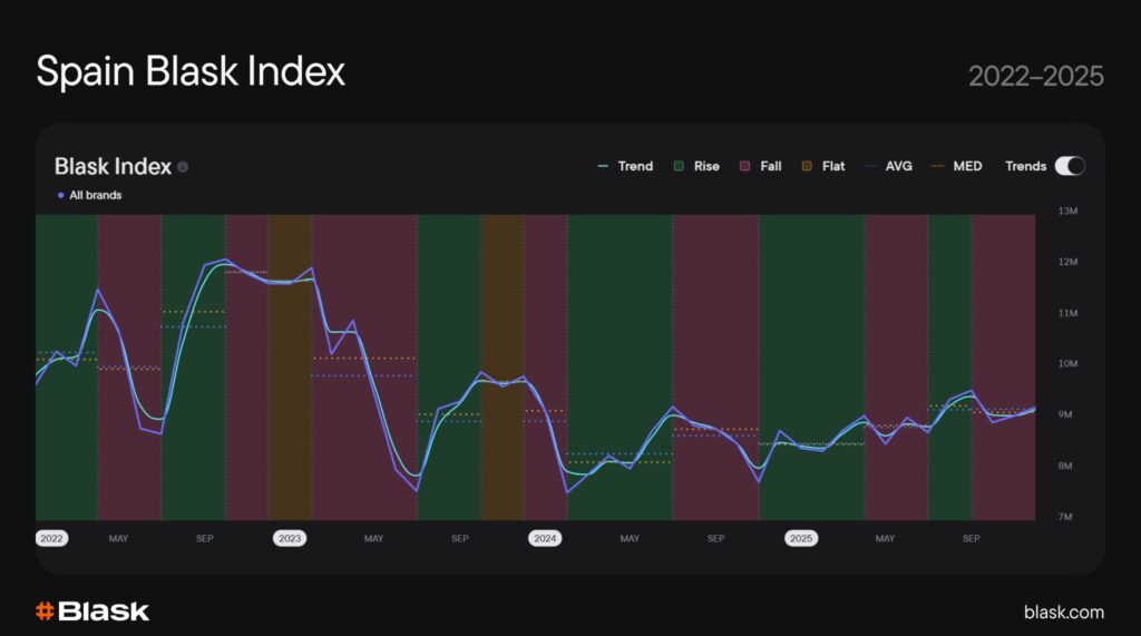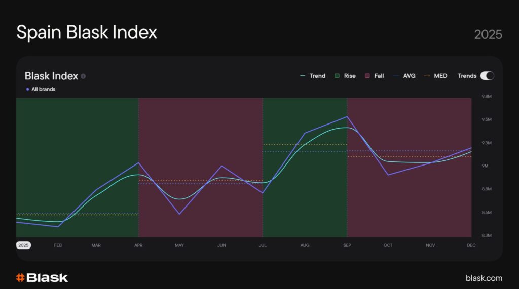 From January to December 2025, the Spanish market’s trend line traced a pronounced ‘M-shape’ — rising from approximately 8.4M in early January to a peak near 9M in March-April, dipping through the summer months, recovering strongly through August-September, before a late-year normalization. Over the full year, Blask Index rose by roughly 5.3%, reflecting measured but sustained market growth despite regulatory headwinds and post-tournament cooldowns.