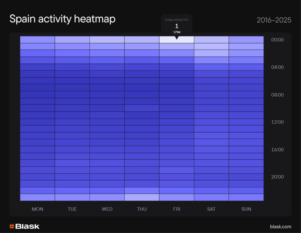 The hourly heatmap reveals a striking concentration: Friday at midnight UTC (1:00 AM local Spanish time) ranks as the single hottest hour of the week.