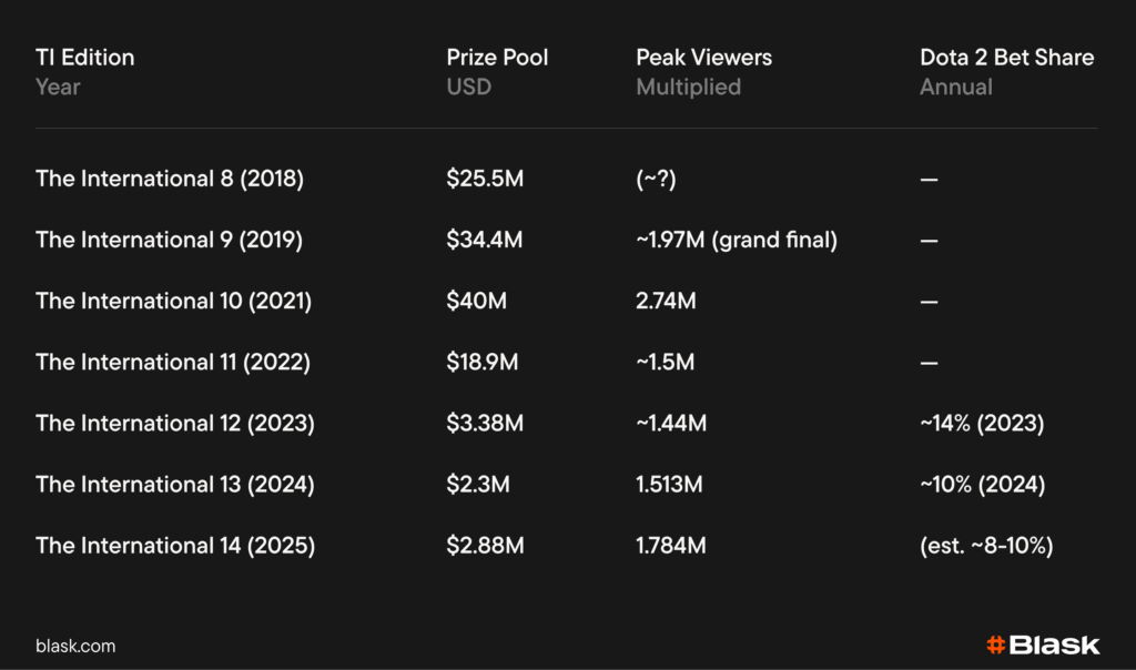 But with Valve’s changes to funding, the prize pools collapsed. TI2023 and TI2024 both stayed under $4 million, while TI2025 rebounded only slightly to $2.88 million. Viewership remains strong (1.78M peak this year, third-best in TI history), but betting metrics tell another story: Dota 2’s share of global esports bets fell from ~14% in 2023 to ~10% in 2024, with The International accounting for just ~3% of total esports betting in Q4 last year.