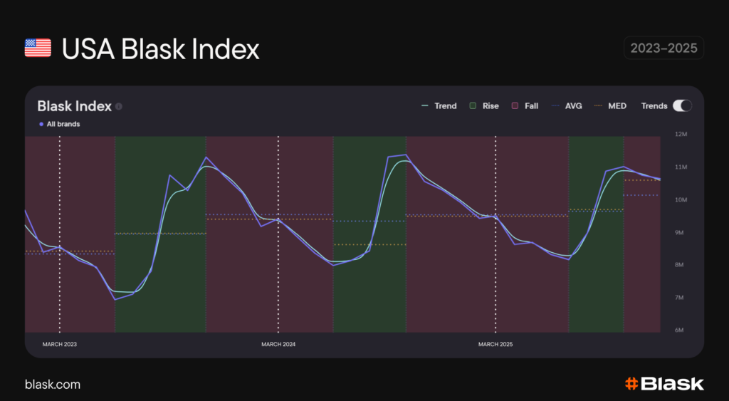The tournament, with 87 years of history, is large enough to shift iGaming demand across the whole US market. Blask Index tends to fall in spring after the winter high, but in March that decline slows and often briefly reverses before continuing the downtrend.