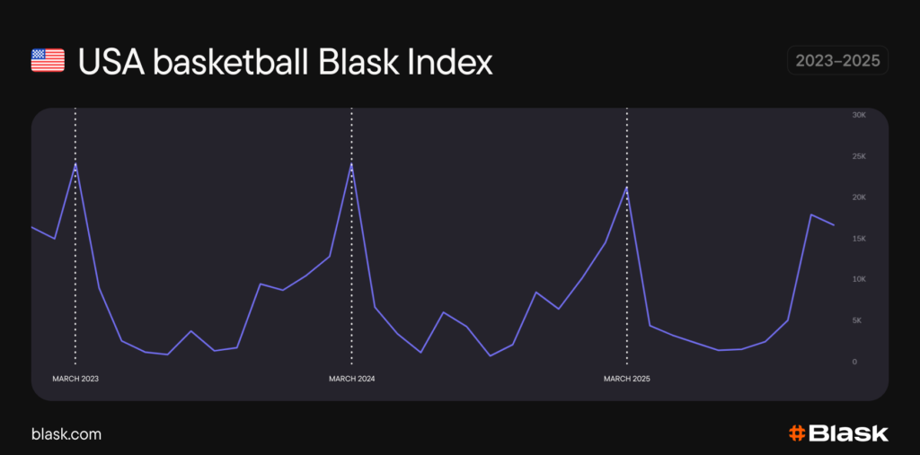 Blask’s Categories feature breaks it down further. March Madness generates the highest demand for online basketball betting of any point in the year. Blask Index of the basketball subcategory peaks exactly in March, which means the NCAA event draws more attention than the opening or high-stakes stages of the National Basketball Association (NBA) season.
