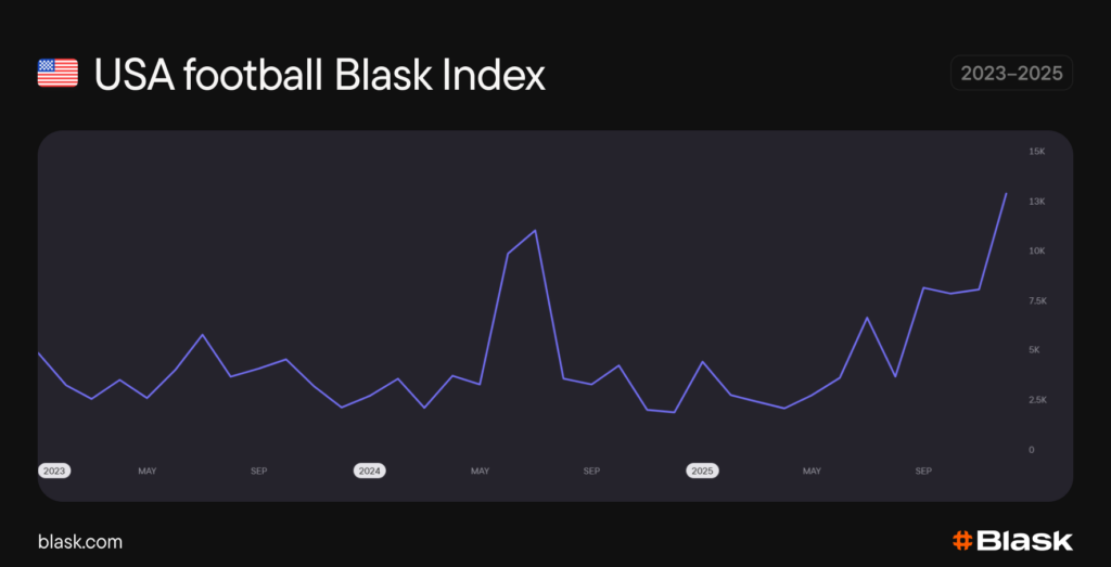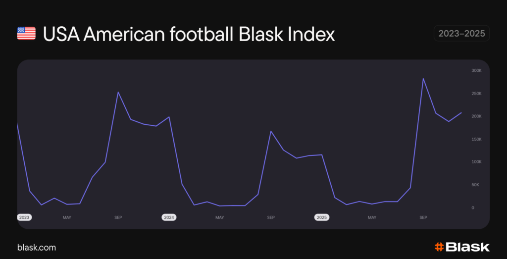 American football — simply called football in the United States — is the country’s number one sport. According to Blask data, it accounted for over 56% of the US online betting demand across 2023–2025 (excluding general interest).
