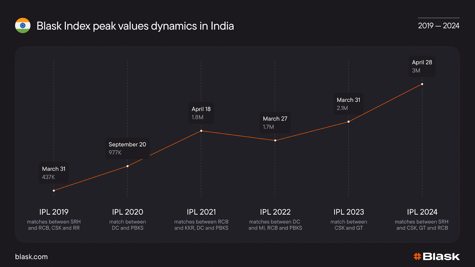 In India, the answer is a loud yes: every year since at least 2019 the highest point on the Blask Index has fallen on an IPL match-day, and the magnitude keeps snowballing — 437K in 2019 till the record 3M in 2024 when two mid-table double-headers featured four marquee teams.