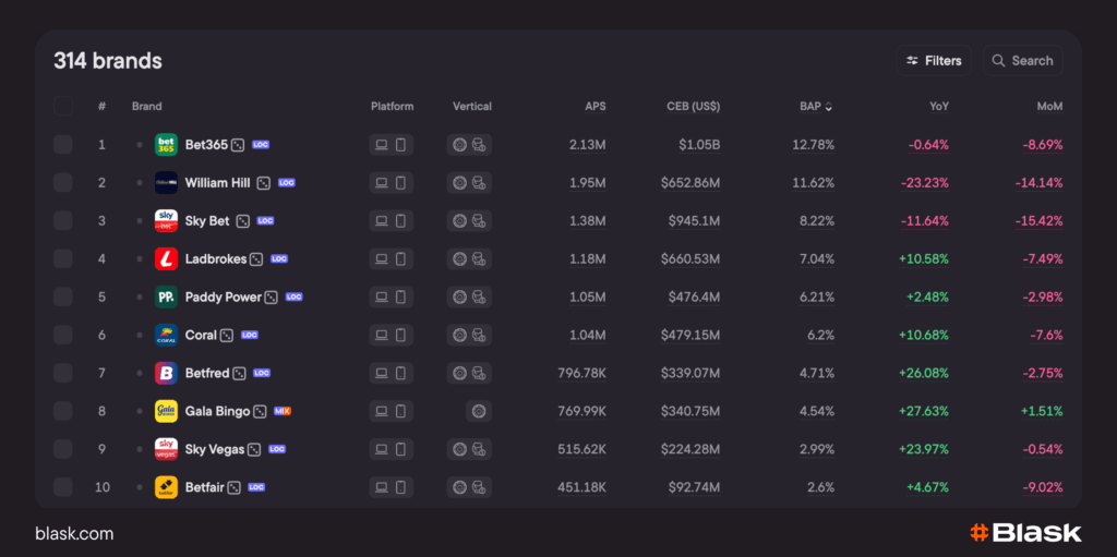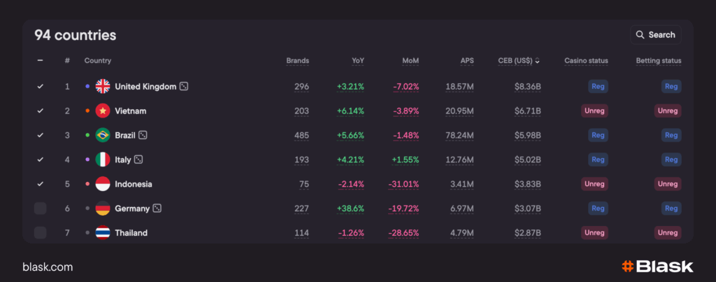 Blask doesn’t just show you any brands; it identifies those that are fully operational in the target country. This means these brands have local support in place, functioning payment systems, and established infrastructure. By partnering with these committed operators, you avoid wasting traffic on brands that aren’t set up to succeed in the region, ensuring your efforts generate real results rather than disappearing into a void.