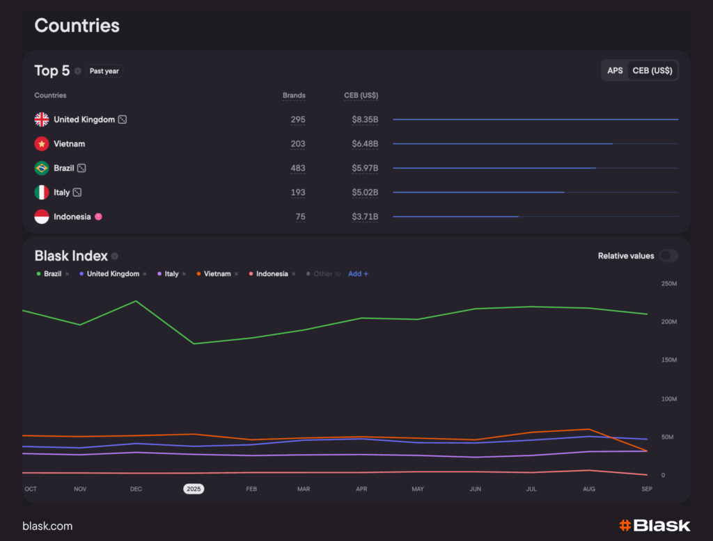 Expansion decisions usually begin with the same three questions: where to go next, who is worth the effort, and what the return will look like. Blask provides hard answers to each. It shows which countries and regions are heating up and which brands are responsible for that heat, allowing you to distinguish markets that are merely large on paper from those that are accumulating the real audience.