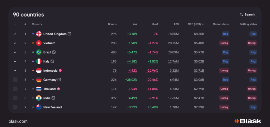 If you build infrastructure for iGaming — payments, content, platforms, KYC/AML, risk tools, analytics — you can’t scale on hunches. Blask turns open‑source market signals into a clear, comparable view of where demand is forming, which brands are accelerating, and what each country is likely to return. The result is fewer cold pitches, fewer dead‑end integrations, and smarter expansion into the right markets at the right time.