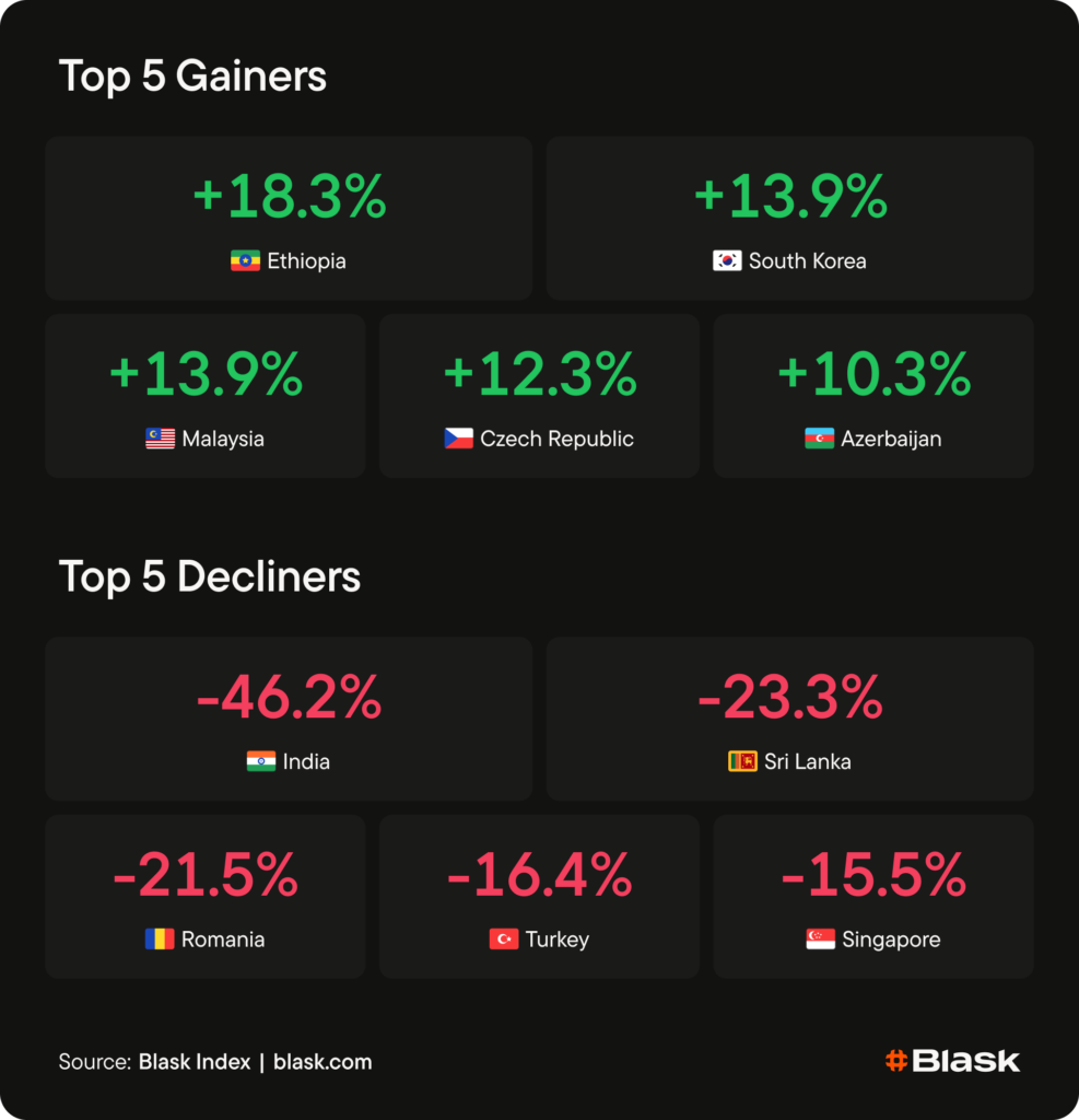 - Ethiopia +18.3% — No clear country-specific trigger surfaced. The gain reads as a technical bounce after the prior week’s –16.5% decline.
