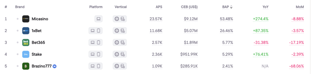| 3 | Bet365 | 1,788 | $1.3M | –34.9% |
