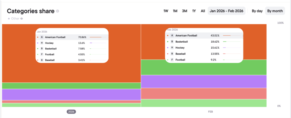 For context: American Football Blask Index in January 2026 (NFL playoffs) reached 172,578. In February, it dropped to 51,007 as the season ended — but basketball rose to 24,107 and hockey to 10,035 simultaneously. Super Bowl absorbed and redistributed demand across the entire sports calendar in a single weekend.
