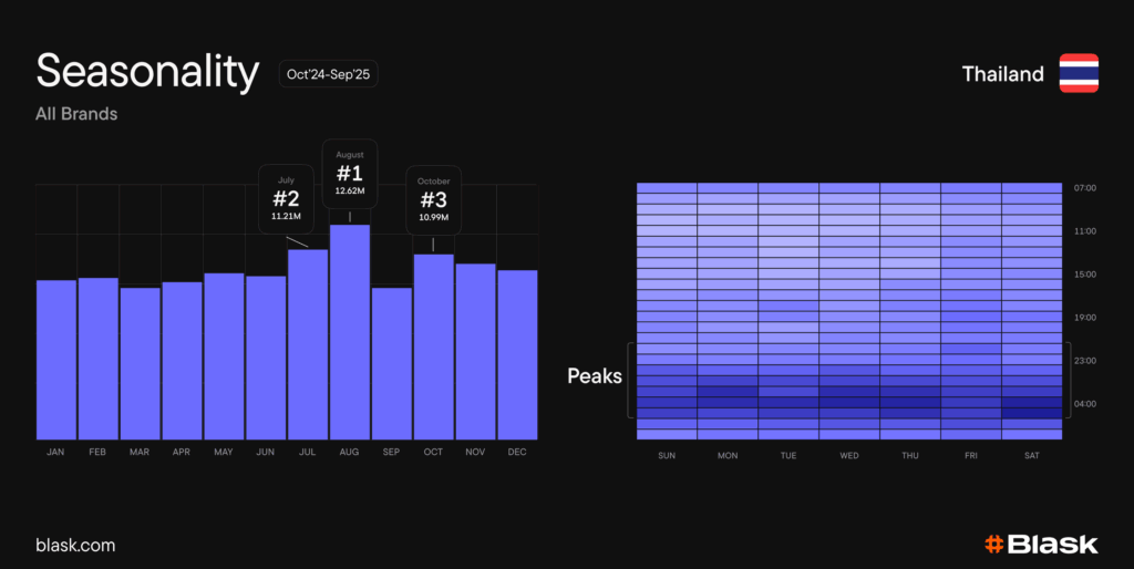 A classic night-owl economy: heat moves screen time into late evening and night; hospitality and tourism shifts are big, plus periodic spikes around paydays and national lottery draw dates on 1st and 16th that ripple through broader interest.