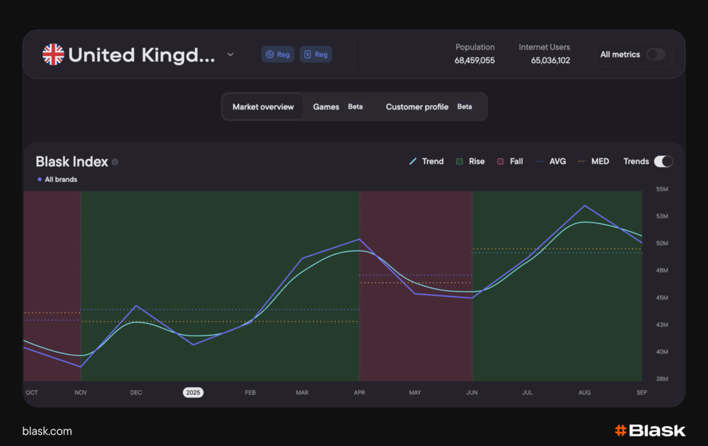 Seasonality ships as a core piece of the Blask Index Trends release and pairs perfectly with rise and fall segments, baselines, and country overlays, providing both the shape of demand and its timing.