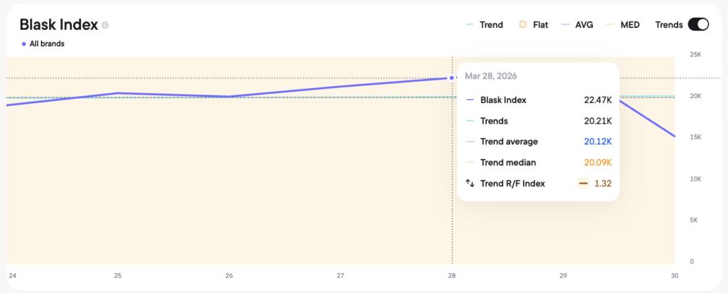 In the week before IPL 2026 launched (March 21–27), India’s total Blask Index averaged 1.4M per day. On March 28, it hit 2.3M. The following day it climbed to 2.4M.