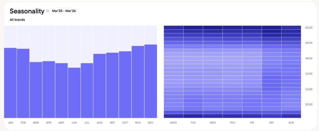 The Blask data becomes most operationally useful at sub-weekly resolution. Italy shows a football-anchored weekly structure, but the pattern is more textured than a simple “Saturday spike” narrative.