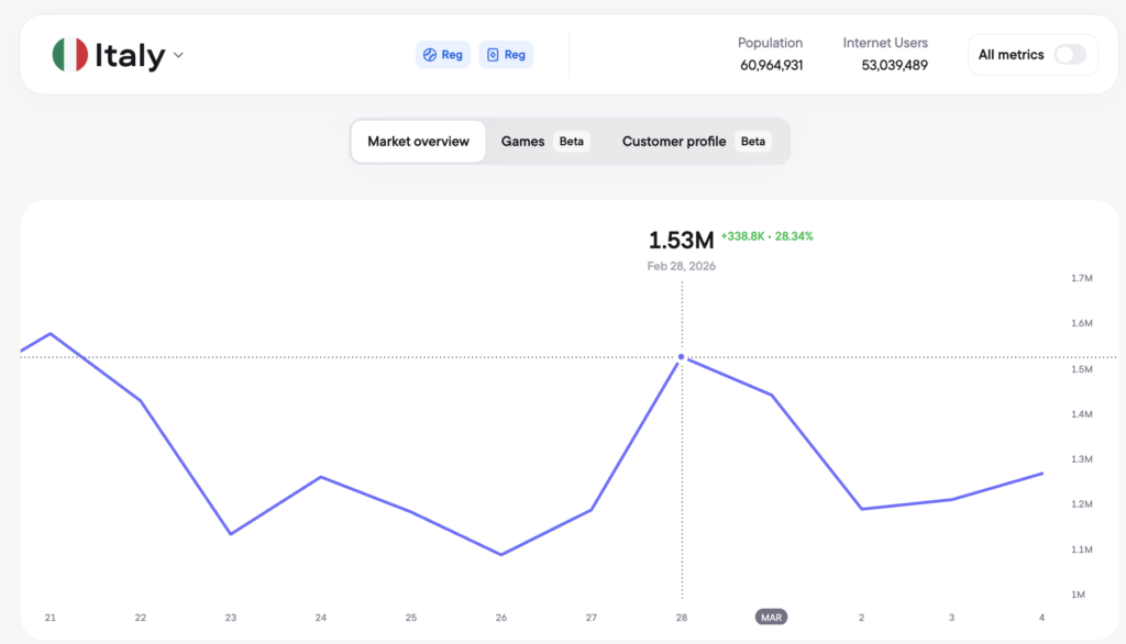 Italy’s online betting penetration sits at 55 percent. Its online gaming penetration is 26 percent. The gap between those two figures is one of the largest in Europe, and it sits directly in the demand corridor that Blask’s weekly heatmap identifies as persistent evening engagement — not driven exclusively by sports fixtures, but amplified by them.
