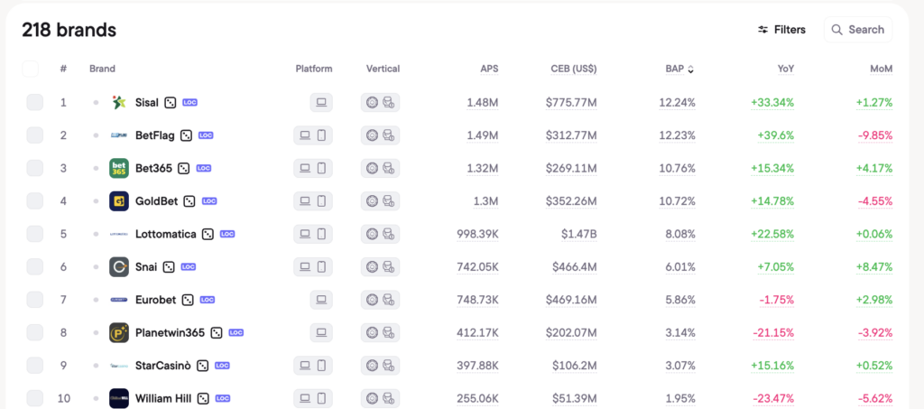 Italy’s competitive structure heading into the spring 2026 fixture stretch is the most consolidated it has been since legalization. Lottomatica, which reported full-year 2025 revenues of €2.26 billion — up 12 percent year-on-year — now holds 31.3 percent of total online market share, with online sports betting share at 32.4 percent. Group CEO Guglielmo Angelozzi described 2026 as “a year of further consolidation and evolution,” with 2026 revenue guidance set between €2.39 billion and €2.46 billion.