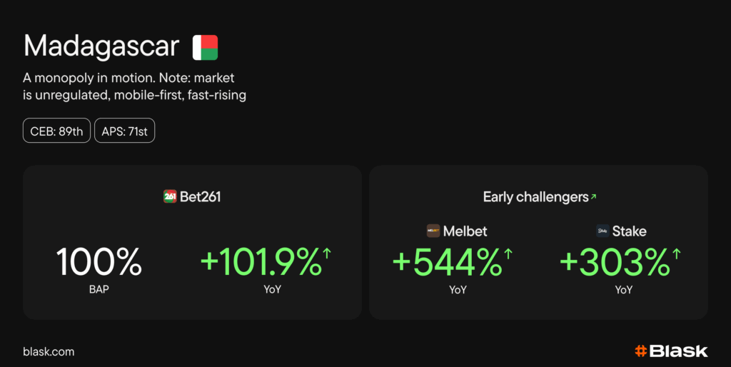 Blask data shows Bet261 holding a complete lead with 100% Brand Accumulated Power (BAP), making Madagascar one of the few single-brand markets currently observed.