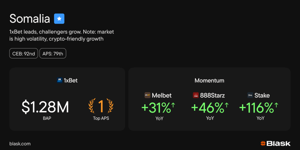 Somalia’s unregulated market is led by 1xBet, holding 88.7K APS and $1.28M CEB, followed by Melbet, 888Starz, and Stake, each recording double- and triple-digit growth.