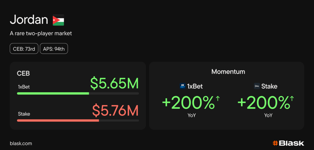 Jordan’s market is shaped by a near-even split between 1xBet and Stake, holding 50.5% and 49.5% BAP, respectively, and both recording over +200% YoY growth.