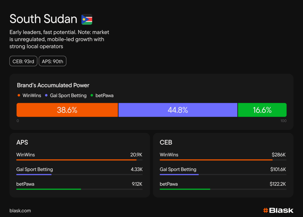 Early data from South Sudan highlights WinWins (38.6% BAP), Gal Sport Betting (44.8%), and betPawa (16.6%) as leading brands in an unregulated and fast-growing environment.