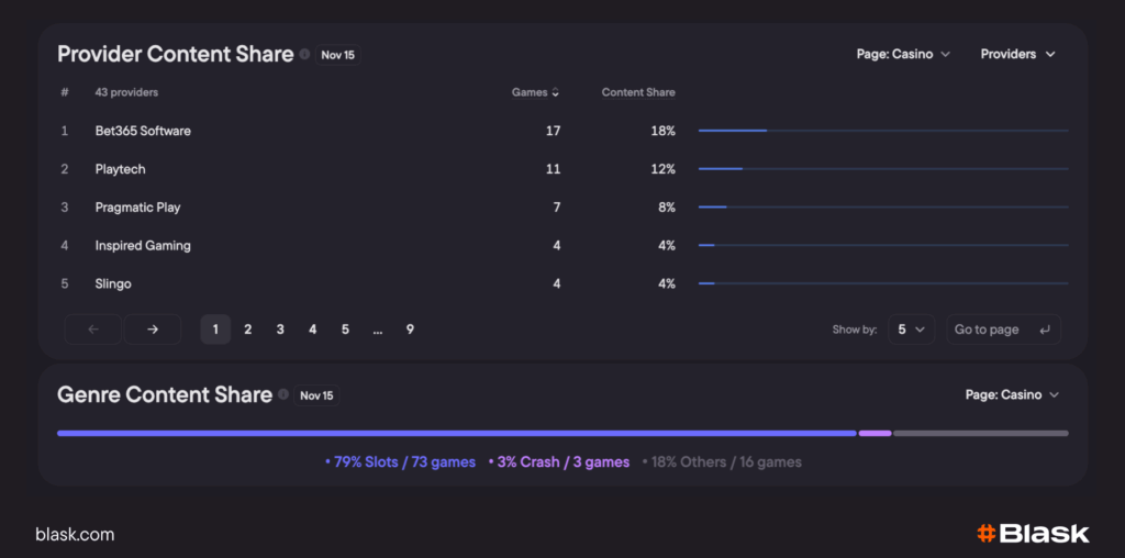 Blask just released a powerful upgrade for iGaming professionals: Provider Content Share and Genre Content Share, two brand-level widgets that reveal exactly how casino pages are structured.