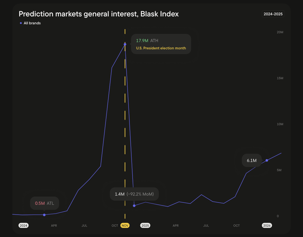 Interest on the Blask Index metric reached 17.9M in November 2024, the highest level ever recorded for the vertical, as users flocked to platforms such as Polymarket and Kalshi to trade contracts on electoral outcomes.