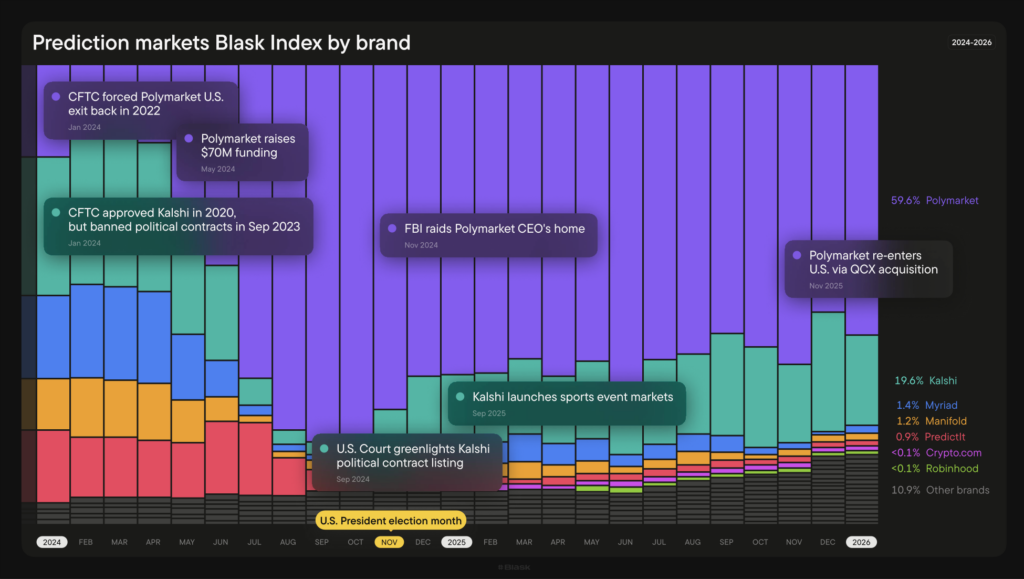 Polymarket accounts for approximately 59.6% of total prediction market demand
