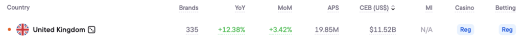 The UK gambling market generated an estimated $11.5B in Competitive Earning Baseline (CEB) across all regulated brands in 2025, with an Acquisition Power Score (APS) of nearly 20 million new customers per year ($8.4B–$20.9B CEB range; 14.7M–35.3M APS range).
