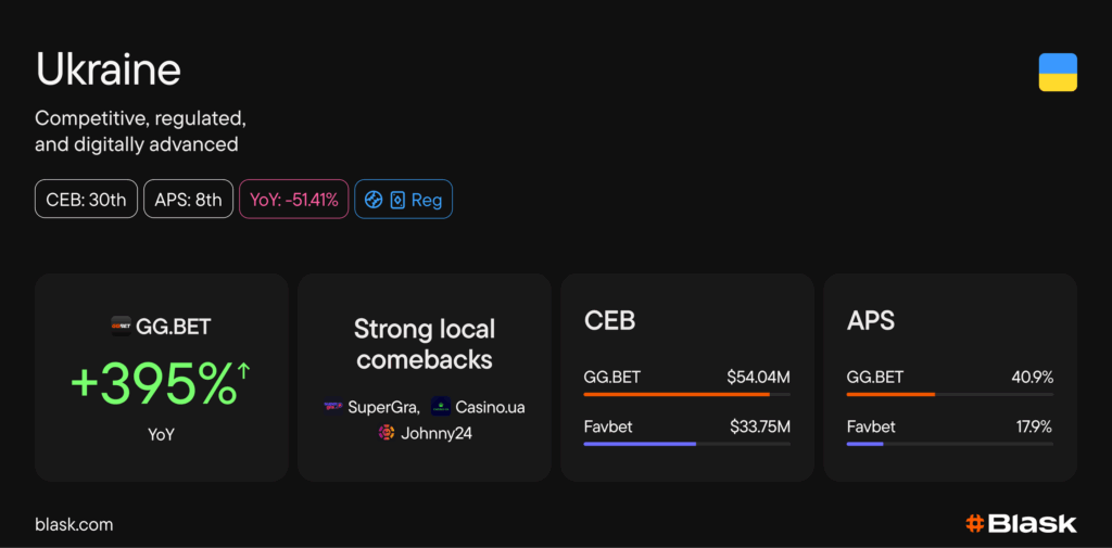- Local brands: Casino.ua, SuperGra, Johnny24 posting notable YoY growth. This market illustrates how regulation, brand heritage and digital growth can coincide.