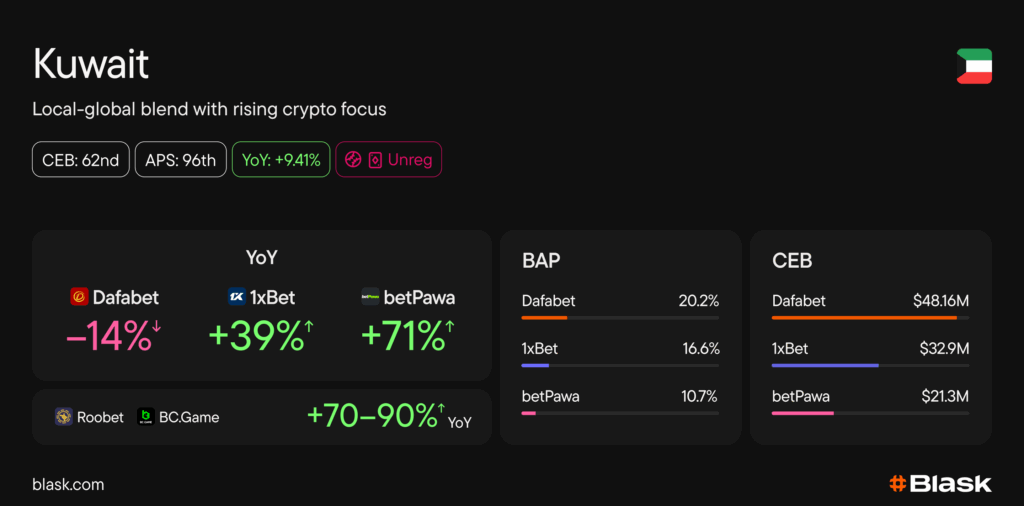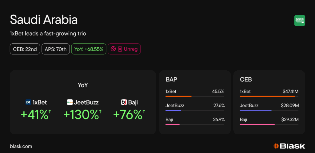 - JeetBuzz & Baji showing rapid momentum: +129%, +76% respectively. The mobile-only nature, English/Arabic language mix and favourable demographics make this a high-growth frontier.