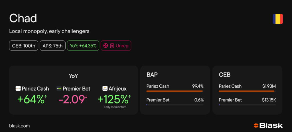 - Afrijeux: Early-stage but showing +125% YoY growth. Mobile-first, unregulated settings and low competition make Chad a natural “future growth” country.
