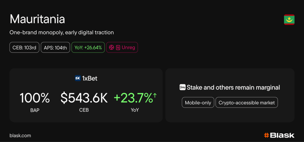 - Other brands marginal today, but potential is high. Operators entering Mauritania should treat it as a green-field: mobile-optimised, low CAC and first-mover advantages apply.