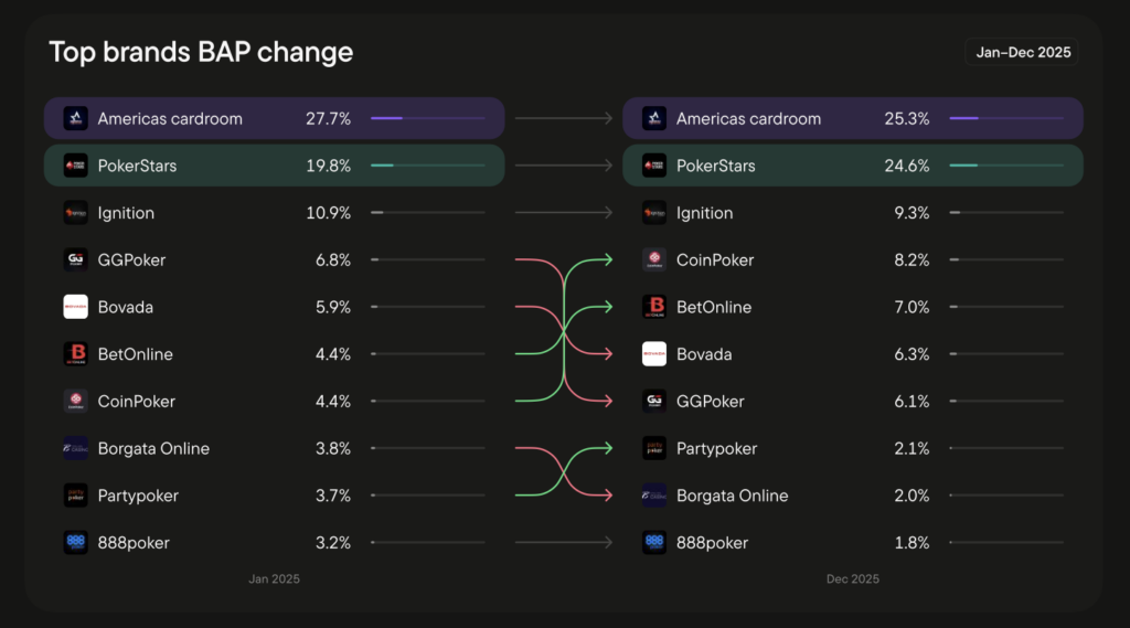 PokerStars, BetOnline, and CoinPoker each gained share versus their January 2025 positions, while GGPoker and Bovada’s poker room gave back some of the ground they had held at the start of the year.