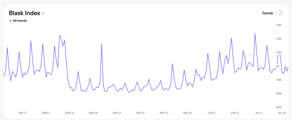 An operator watching their own registration numbers sees the spike when it arrives. The Blask Index shows the market-level signal — across all tracked brands simultaneously — which means the pre-event build-up is visible before any single operator has confirmed it in their own data.