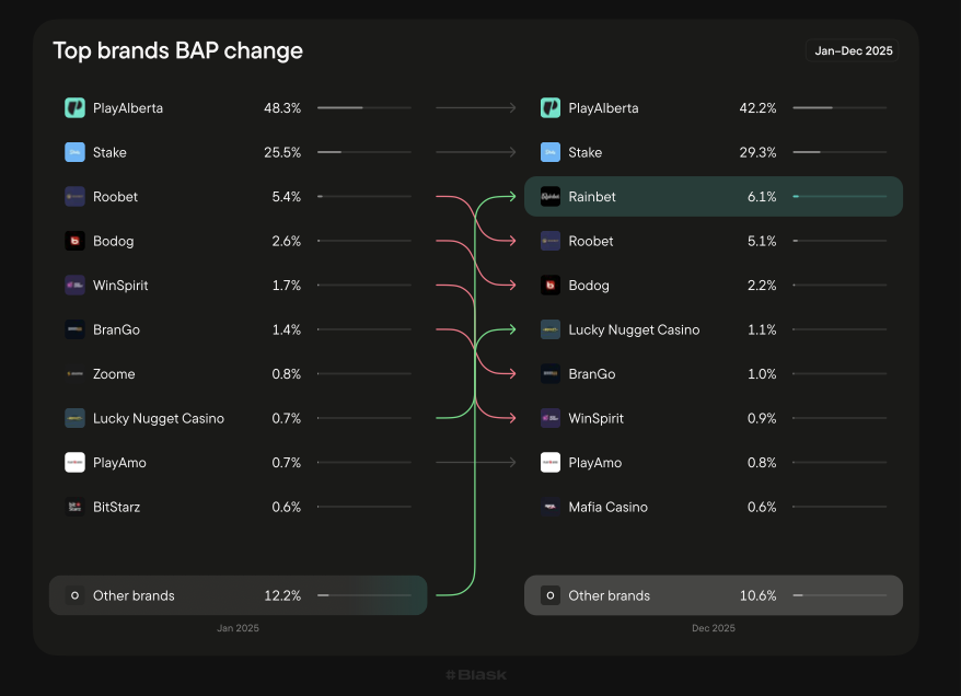 In February 2025, the share of offshore platforms in Alberta reached 54%, up 7 percentage points from March 2024. Over the same 12 months, the state monopoly PlayAlberta lost 7.4% points, falling to 47.2%. Concurrently, the unregulated crypto-brand Stake grew by 166.5% YoY within the province.