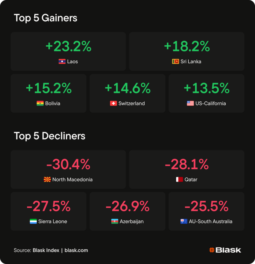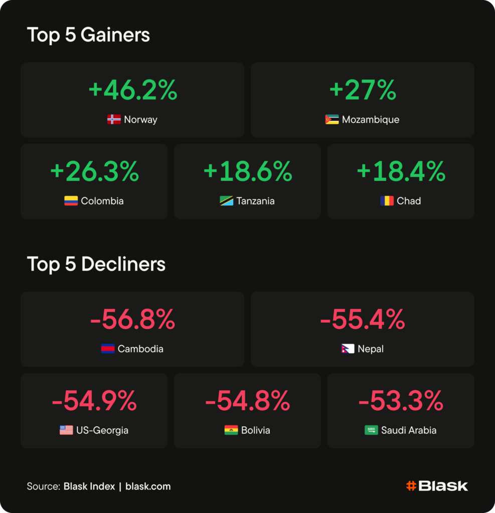 Region showed a narrow but extreme split. Norway led the entire board at +46.2% on the Eliteserien restart, while Switzerland — last week’s European leader at +14.6% — dropped out of the top movers entirely as its gain baked in. No other European market appeared in either direction, indicating a quiet continent outside the Nordic football cycle.