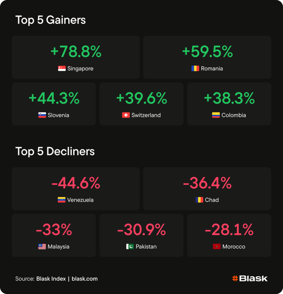 Romania +59.5% — The biggest European upside move, flipping from last week’s –21.5% decline into a high-volatility recovery. The week followed Romania’s hosting of a major PGL event in Cluj-Napoca, keeping Romania in an internationally visible competitive-gaming news cycle.